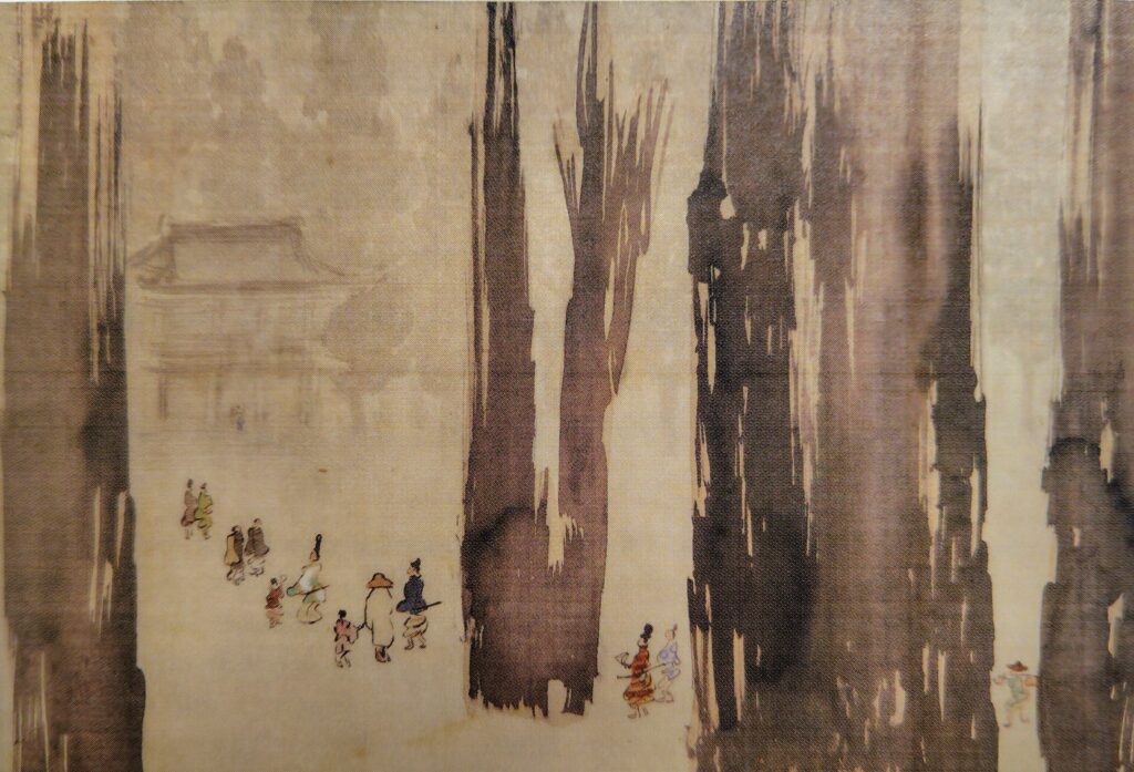 For the sake of the perpetuation of the Law and kosen-rufu, with strong reluctance, Nikko Shonin left Mount Minobu with Nichimoku Shonin and other disciples in the spring of the second year of Sho-o (1289), taking the Dai-Gohonzon of the High Sanctuary of the Essential Teaching, the Daishonin’s ashes, his Gosho writings, and all his other mementos.